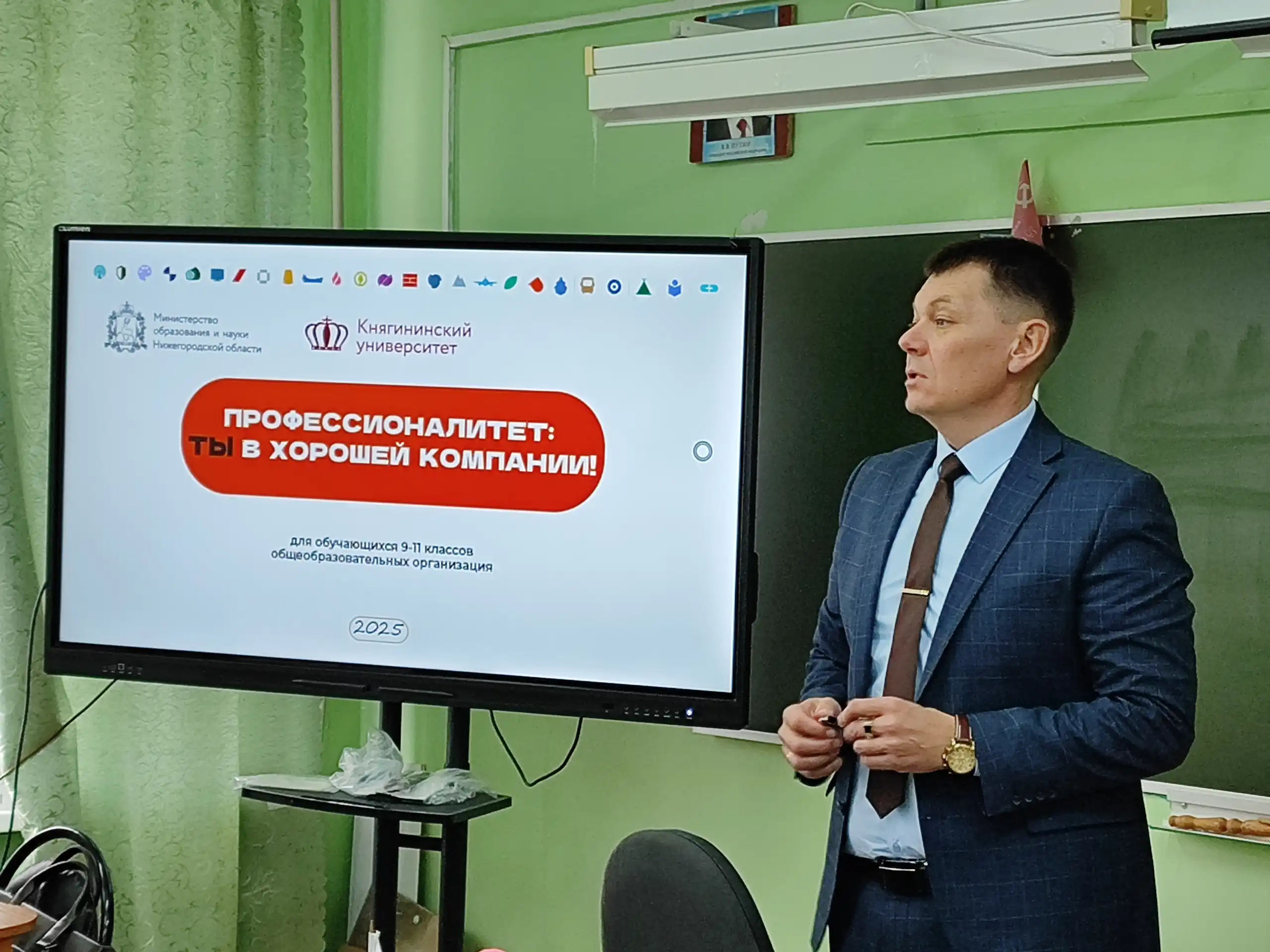 В ходе классного часа заведующий кафедрой «Организация и менеджмент», к.э.н., доцент С.Н. Козлов рассказал ребятам о сельскохозяйственном кластере ФП «Профессионалитет», созданном на базе Княгининского университета, программах подготовки и правилах приема на направления обучения данной федеральной программы и познакомил с особенностями поступления в НГИЭУ в 2026 году.